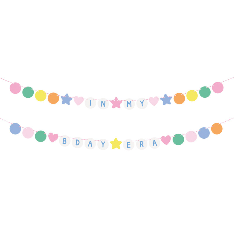 Decorate for a slumber party with this In My B Day Era Banner Set. This kit includes two different banners, one with "IN MY" and the other "BDAY ERA" with colorful printed cardstock dots, hearts, and stars, resembling the beads of friendship bracelets. Package includes 2 count banners measuring 7ft each.