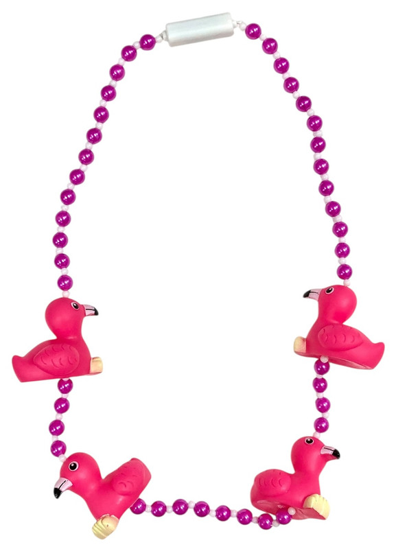 This Light Up Pink Flamingo Rubber Duck Bead Necklace is a delight to wear to Spanish Town! This necklace features four light up cute hot pink flamingo rubber ducks with pink and white beads. One size fits most.