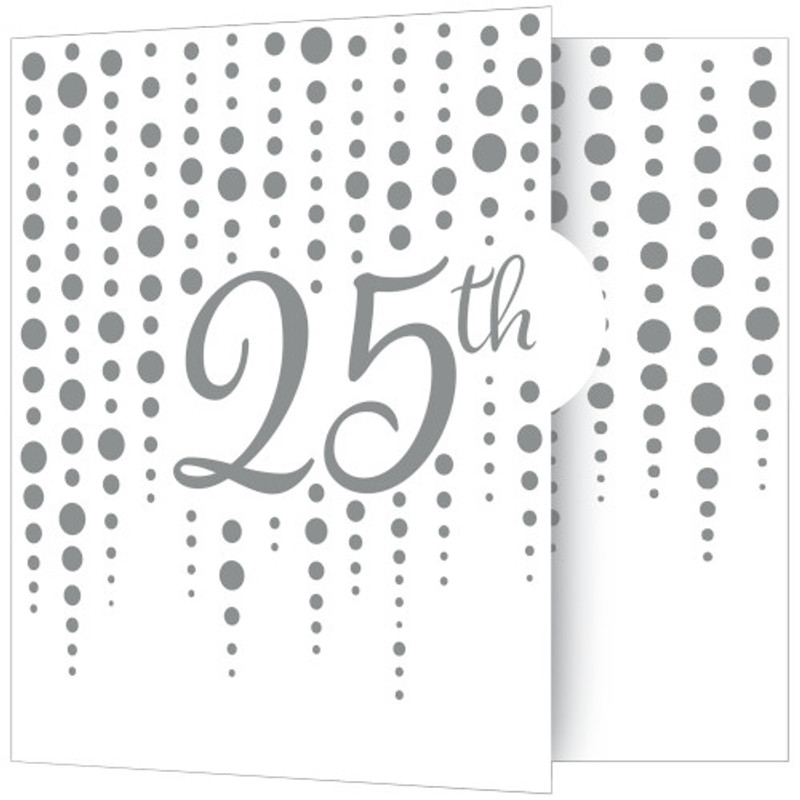 Send out these Sparkle & Shine Silver Invitations to your 25th anniversary celebration! These white invitations feature 25th in silver letters with matching assorted dot accents. Package includes 8 4.5in x 4.5in invitations and envelopes.