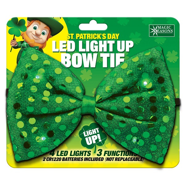 Wear some sparkle around your neck with this St. Patrick's Day Light Up Bow Tie! This shimmery green tie features 4 led lights with 3 flashing modes and an attached elastic band. One size fits most.
