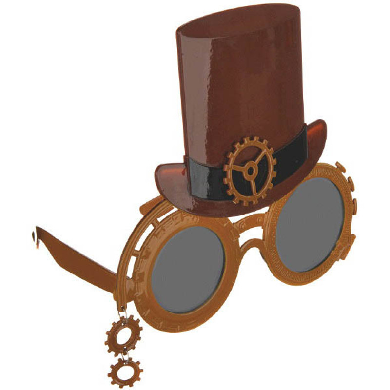 Turn into an industrial era character with these Steampunk Fun Shades! These novelty glasses feature bronze plastic frames with attached dangling gears and a plastic top hat. One size fits most.