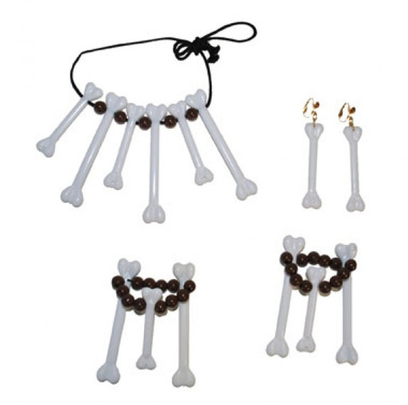 This Bone Jewelry Set will have you looking cave-chic this Halloween! Package include 2 count plastic bracelets with brown beads and bone shape pieces, as well as a matching necklace on a black nylon cord and two clip on earrings. Bone pieces measure 2.75in and some 4in. One size fits most.