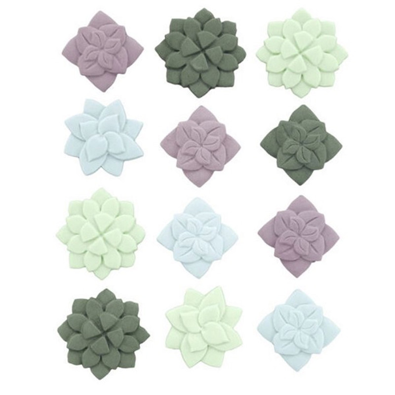Give your cake creations and more some southwestern flair with these Succulents Royal Icing Decorations! These edible icing decorations feature light green, dark green, blue, and purple succulent designs. Package includes 12 - .1.25in to 1.5in icing decorations.