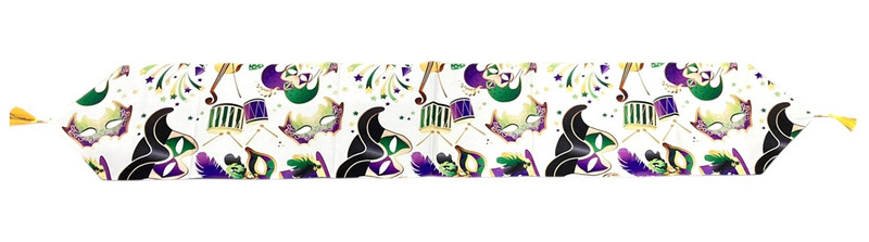Add some glamour to your table with this All Mardi Gras Table Runner! This white cotton fabric runner features a printed pattern of Mardi Gras imagery such as masks, confetti, and instruments in purple, green and gold, with yellow tassels on the ends. The underside is solid purple fabric. Measures 12.25in x 71in.