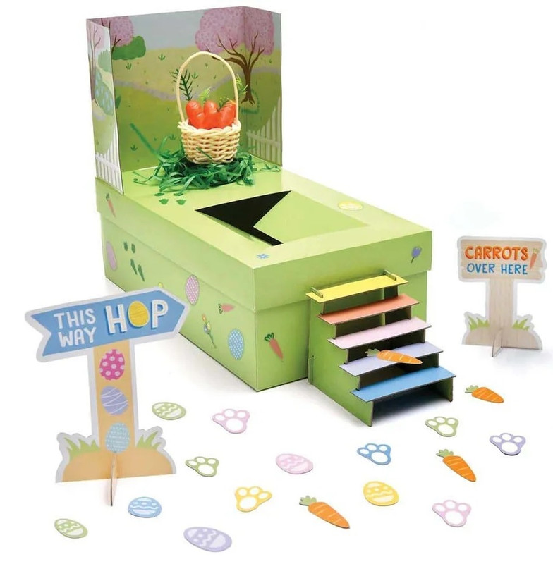Package includes a box with trap door, a background, Easter grass, stickers, cutouts, small signs, a mini basket and carrots, and steps.