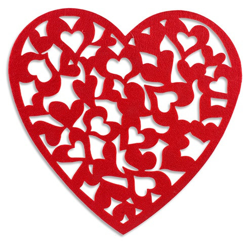 Description Add a festive touch to your table setting with this Felt Heart Placemat. Die-cut in a red heart shape, this placemat features mini heart cutouts inside for a charming, textured design. Measures 14in x 13.25in. Additional Details SKU: PT_0676844380990