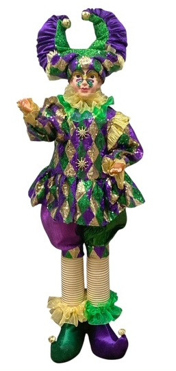 Add whimsical charm to your décor with this Light Skin Standing Jester. Dressed in shimmery purple, green, and gold, with a ruffled collar and bells on his pointed shoes and two-pointed hat, this jester features somewhat posable arms. His face is adorned with a purple green and gold glitter mask design. Measures about 33in tall with the hat.