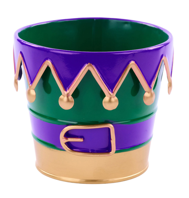 Plant some fun flowers or create an interesting display with this eye-catching Mardi Gras Jester Pot! This dark green tin pot has a gold base, purple belt with gold buckle, and a rim decorated to look like the purple and gold collar of a jester. Measures 5in in diameter, 4.5in tall.