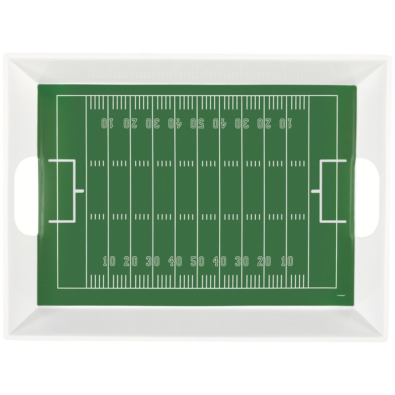 Complete your tailgate buffet with this Game Face Football Serving Tray. This white, rectangular plastic tray has a print of a green field with white lines and numbers, like a football field. It has handles on the sides for easy transport. Not for use with hot foods. Measures 20in x 15in x 2in.