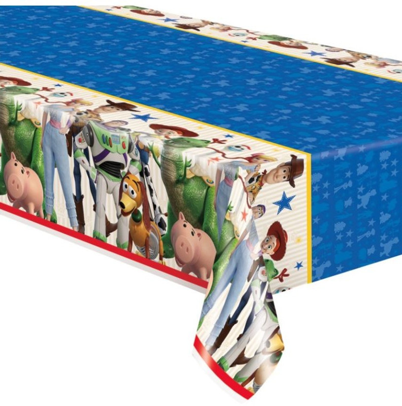 Set the scene for adventure with the Toy Story Plastic Tablecover! The top features a blue background patterned with lighter blue silhouettes of Toy Story characters. Along the edges, an off-white striped border is decorated with stars and a colorful, repeating lineup of beloved characters including Woody, Buzz Lightyear, Bo Peep, Jessie, Slinky Dog, Rex, Hamm, and Forky. Measures 54in x 84in.