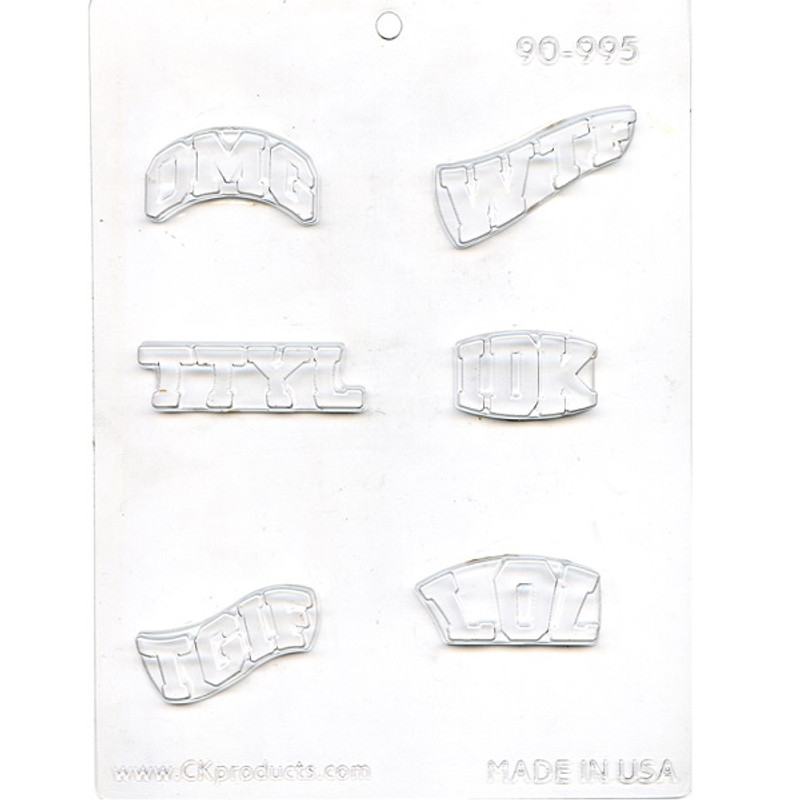 Make some tasty trendy treats with this Text Lingo Chocolate Candy Mold! This reusable plastic mold features OMG, WTF (where's the frosting), TTYL, IDK, TGIF, and LOL. Mold has 6 assorted size cavities.