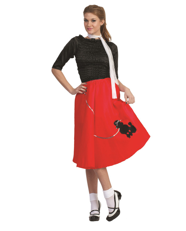 Take a trip back to the fabulous '50s with this Adult Red Poodle Skirt Costume. This classic retro outfit includes a white lace scarf, and a red poodle skirt featuring a black poodle applique with a silver sequin leash detail. Shoes, socks, and shirt not included. Standard size 8 - 12.