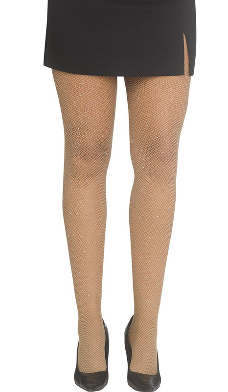 Glitz up your legs with these Rhinestone Bling Tan Fishnet Stockings! These classic tan fishnet style stockings made of nylon and spandex feature iridescent acrylic rhinestone accents. One size fits most.