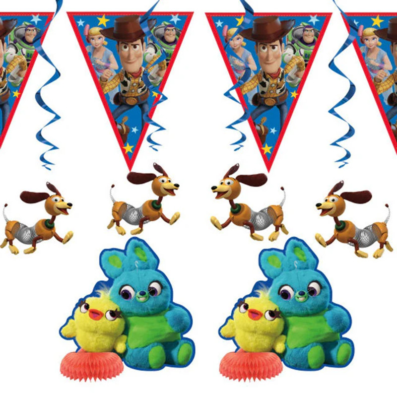 Transform your space with our Toy Story 4 Decoration Kit! This fun set includes two mini honeycomb decorations featuring Ducky and Bunny, four hanging swirl decorations with Slinky, and an 8-foot flag banner showcasing group shots of Woody, Bo Peep, and Buzz. Perfect for birthday parties or themed celebrations, this kit adds a vibrant touch of nostalgia and excitement, making every moment feel like an adventure in Andy’s room!
