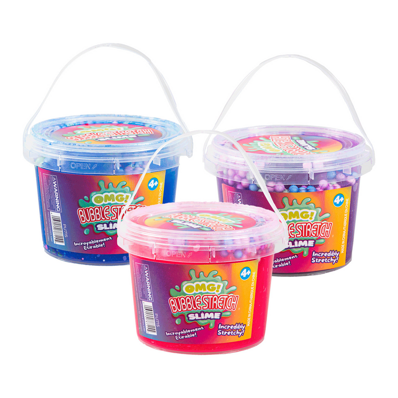Bubble Stretch Slime is a fun, glittery sensory toy that’s perfect for stretching and squishing. Filled with colorful balls for added texture, this slime is available in pink, blue, and purple. It comes in a clear plastic container with a handle for easy storage and portability.