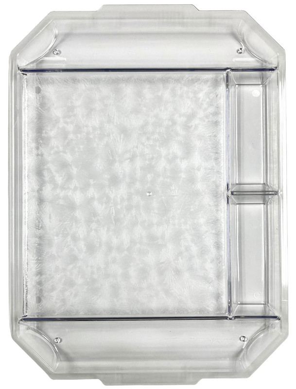 Give your party treats and snacks some glam with this Crystal Cut Frosted Plastic Tray! This long octangular clear plastic tray features a frosted design with long compartments on the short ends, two smaller compartments on one side of the long end, and extended handles. Measures 18.75in x 13.5in with handles.