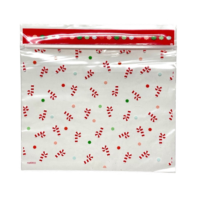 Dress up your holiday treats in festive splendor with these Candy Cane Treat Bags! These re-sealable clear plastic bags feature a red trim along the top and a pattern of candy canes with colorful flower like shapes in between them. Package includes 20 count bags measuring 6.75in.