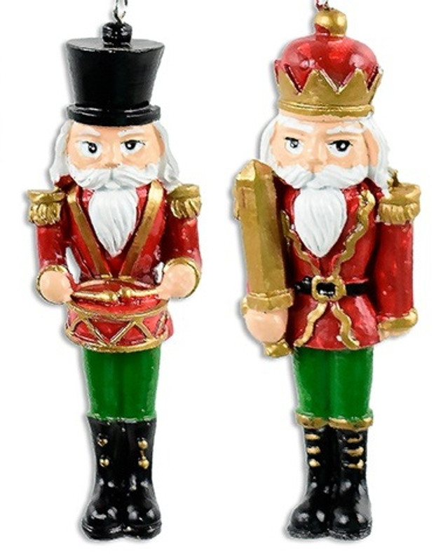 Add a touch of whimsy to your tree or display with a Polyresin Nutcracker Ornament! This nutcracker with a tinsel hanger is available in two designs: one has a black hat and holds a drum, the other has a red crown and holds a gold sword. Desired style not guaranteed. Package includes 1 count ornament measuring 4.7in.