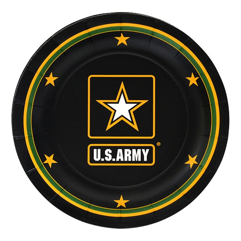 Serve your favorite mess hall snacks and desserts with these U.S. Army Luncheon Plates! These small, black paper plates feature the U.S. Army logo on a black background. Package includes 8 7in plates.
