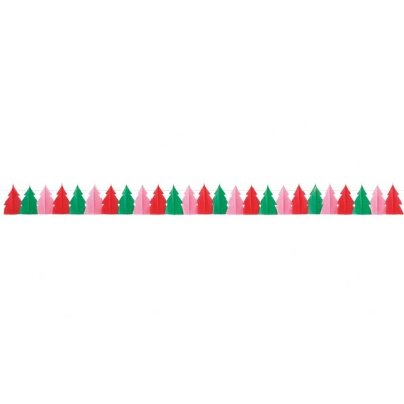 Dress up your holiday celebration in eye-catching colors with this Vibrant Christmas Tissue Garland! This garland features green, red, and pink tissue paper trees with a metallic gold and white hanging string. Measures 14ft.
