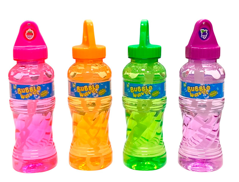 Make fruit scented bubbles with a bottle of Scented Bubble Waves! Designed for outdoor fun, this scented bubble solution and wand is perfect for parties, backyard play, or summer activities. These bottles have colorful containers with the solution scents pink strawberry, orange, green apple, and purple grape. Desired style not guaranteed. Package includes 1 count plastic bottle of 8oz bubble solution with clear plastic wand.