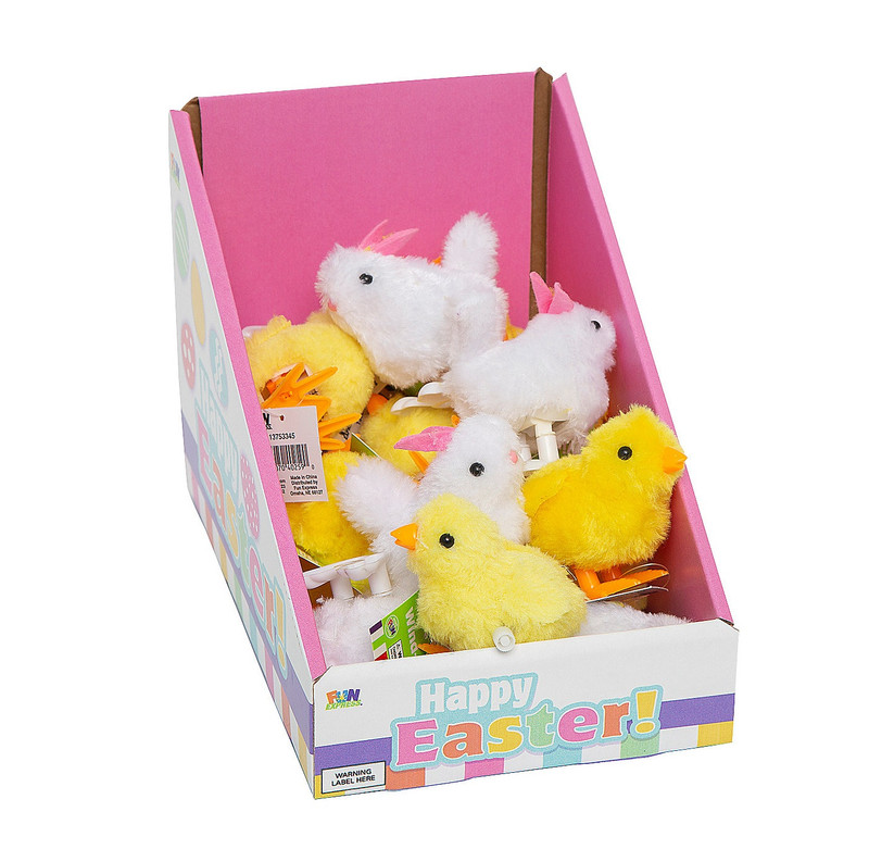 This Fluffy Wind-Up Toy makes a great Easter basket stuffer! This yellow fuzzy chick or white fuzzy bunny features plastic feet that move when wound up. Desired style not guaranteed. Package includes 1 count toy measuring 3in.