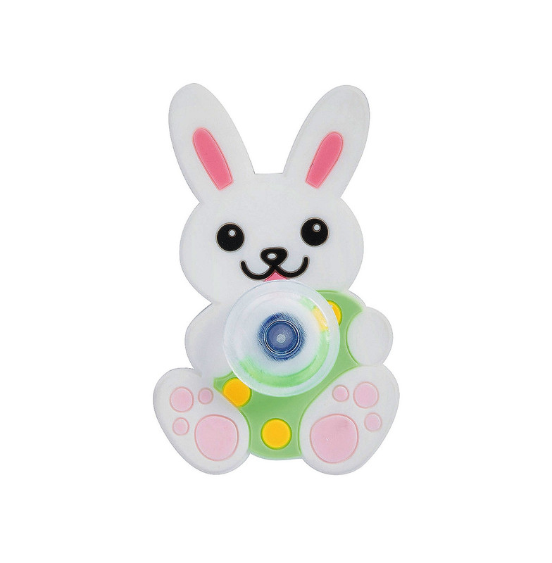This Easter Bunny Fidget Spinner works well as an Easter Basket stuffer! This plastic toy features a smiling white bunny holding a green Easter Egg with yellow spots. Measures 1.75in x 2.75in.