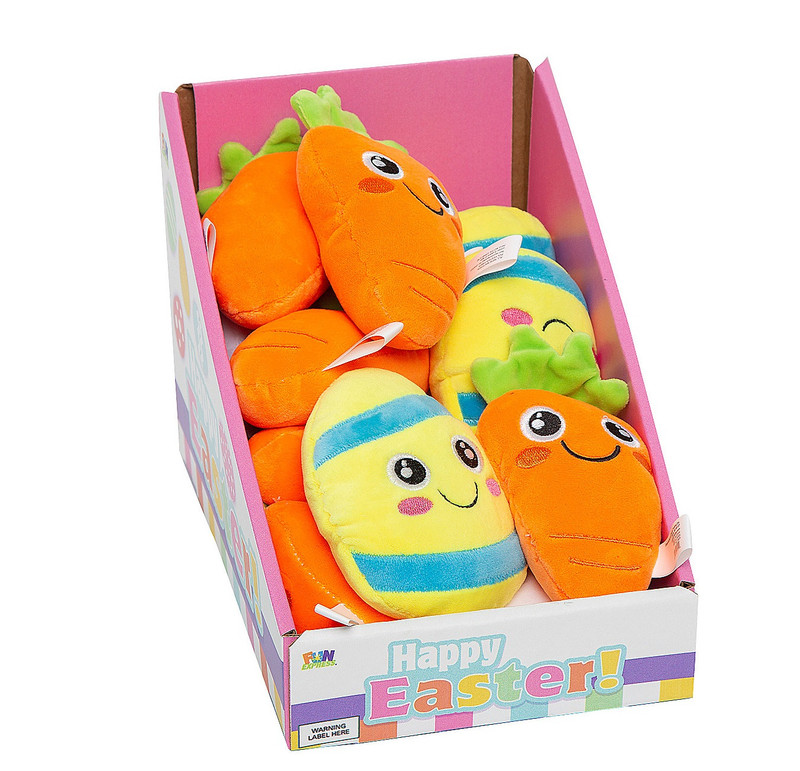 A Easter Sensory Sand Filled Stuffed Character makes for a fun Easter basket trinket. Available as a smiling orange carrot or a yellow and blue striped Easter Egg, this stuffed toy has a squishy feel. Desired style not guaranteed. Package includes 1 count toy measuring 4in x 4.75in.