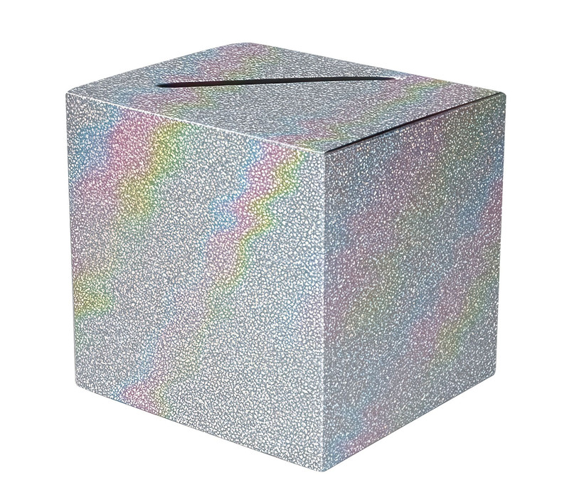 Stack the cards! This All Purpose Prismatic Silver Card Box is perfect for catching those well wishes for any occasion! Graduations, weddings, baby showers, Valentines, and more! This printed cardstock box has an iridescent silver finish and an opening at the top for cards. Assembly required. Box measures 9in x 9in.