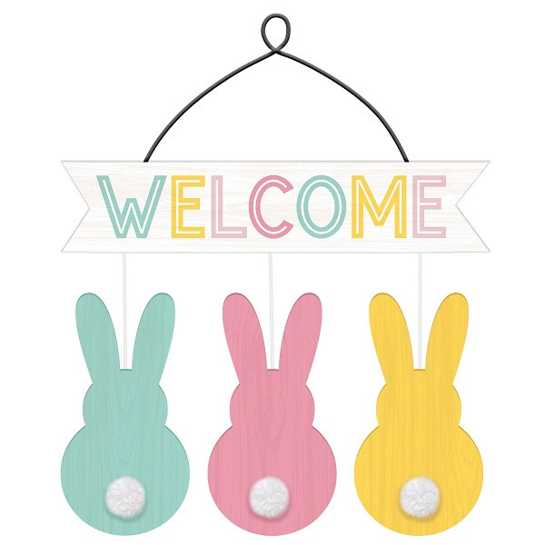 Display a sweet Easter welcome for your guests with this Welcome Bunnies Hanging Sign! This fiberboard sign features attached pastel bunnies with white pom pom tails and a Welcome topper attached to a wire hanger. Measures 17in x 14in.
