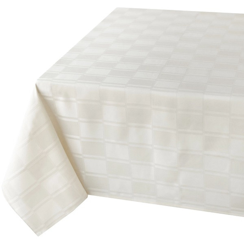 Add some elegant style to your table with this White Dimensions Pattern Fabric Table Cover! This gorgeous white fabric cover features a unique square design. Measures 60 inches by 104 inches.
