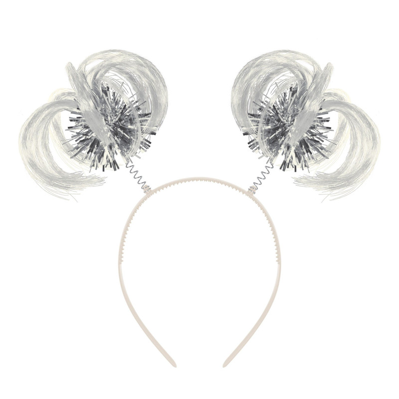 Add a pop of color to your team spirit look with this Ponytail Headbopper! This white plastic headband features 2 white tufts of synthetic hair, along with pom poms of metallic silver tinsel, attached to springs. One size fits most.