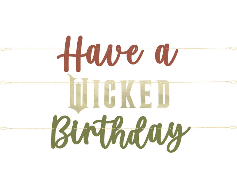 Set a spellbinding scene with this Wicked Birthday Banner. This set includes printed cardstock lettering that spells out "Have a" in muted dark pink script, "WICKED" in gold foil, and "Birthday" in muted green script. Total length measures 11.25ft, about 5in tall.