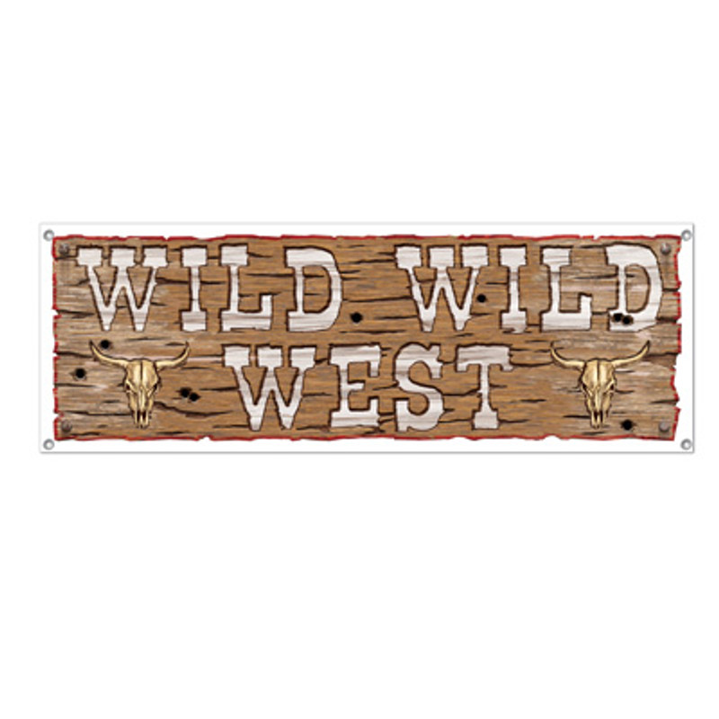 The Wild West is here to stay! Create your own western fun with this Wild West Banner! This plastic banner features “Wild Wild West” with longhorn skull accents. Measures 5ft x 21in.
