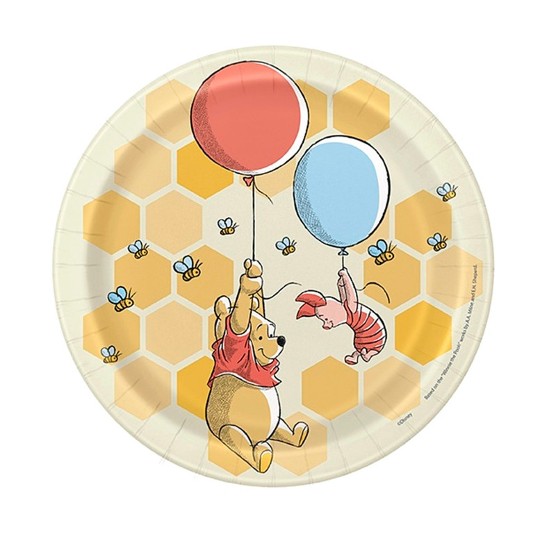 Any fan of the silly old bear would be delighted with these Winnie the Pooh Dessert Plates. Featuring an off white background with a pattern of yellow honeycomb shapes and tiny bees, these paper plates showcase an illustration of Pooh and Piglet floating holding big red and blue balloons. Package includes 8 count plates measuring 6.75in.