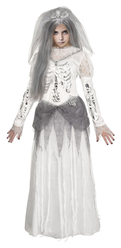 Transform into a ghoul in love with this Ghostly Bride costume! This costume features a white gown with lace and silver bone accents, as well as a matching floral veil. Wig not included. Small fits sizes 4 - 6, Medium fits sizes 8 - 10, and Large fits sizes 12 - 14.